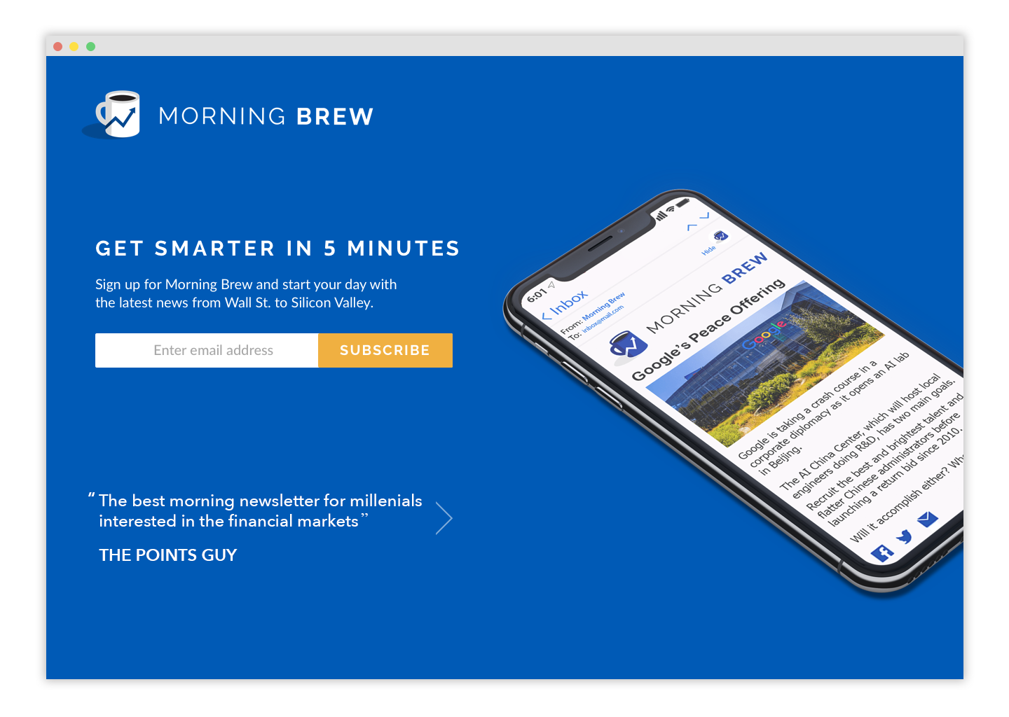Morning brew is the future of business news. Informative witty and everything you need to start your day. Under ceo alex lieberman and coo austin rief the daily business newsletter morning brew has grown its subscriber base to 700 000. The daily email newsletter covering the latest news from wall st.